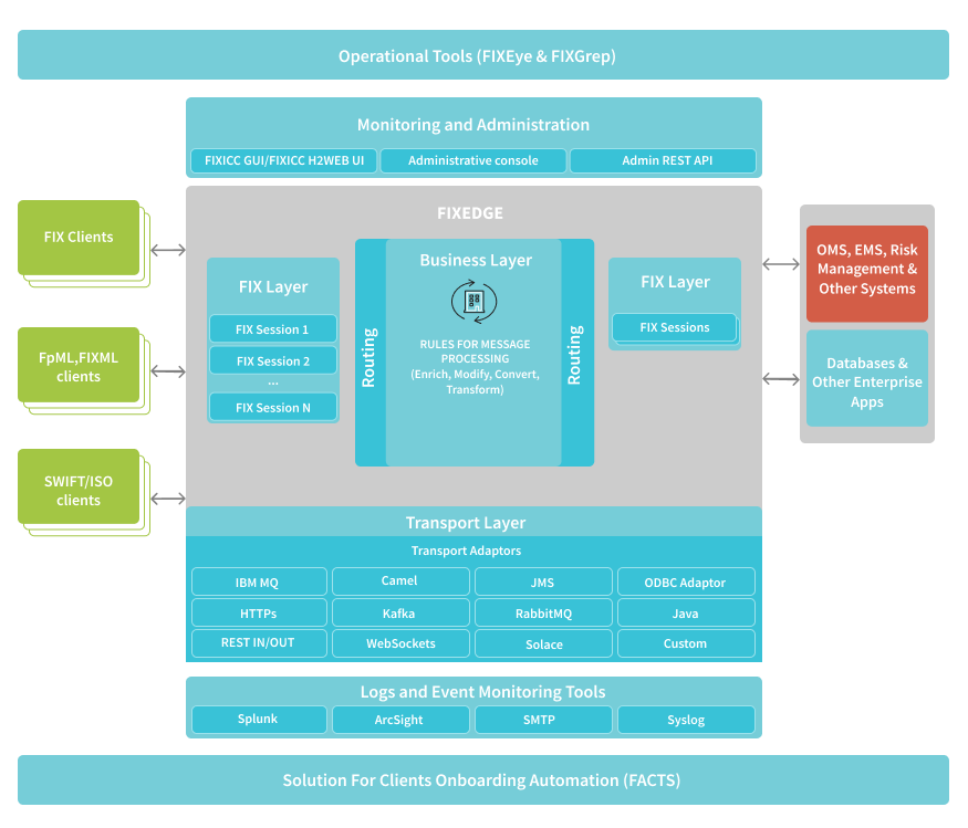 Client applications communicate with FIXEdge via one of multiple supported message protocols (e.g. JMS, IBM MQ,REST) employing transport adaptors. It is designed to be easy to install, configure, administer and monitor sessions and trading information flows. It is written in C++ and has a performance profile suitable for the needs of all clients up to and including large sell-side institutions and large volume traders. FIXEdge adheres to the best information security practices defined in FIX security recommendations.